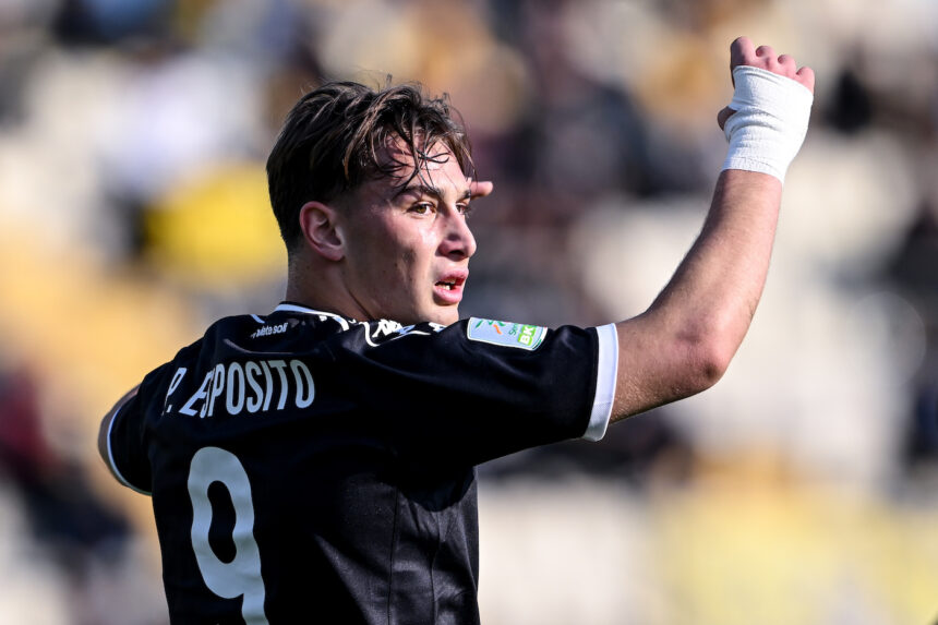 MODENA, ITALY - FEBRUARY 15: Francesco Pio Esposito of Spezia calcio gestures during the Serie B match between Modena FC 2018 and Spezia Calcio at Stadio Braglia on February 15, 2025 in Modena, Italy. (Photo by Image Photo Agency/Getty Images)